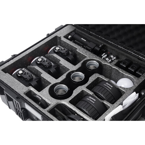 The Aputure STORM 80c 3-Light Kit is an all-in-one professional lighting toolkit—three STORM 80c lamps featuring the BLAIR-CG light engine, Hyper Reflectors, CF4 Fresnels with Barn Doors, Mini Lantern Diffusers, the Light Dome 40 Diffuser, Bowens Adapter, Handheld Bracket, battery cables, and mounting clamps, all in a hard-shell rolling case.